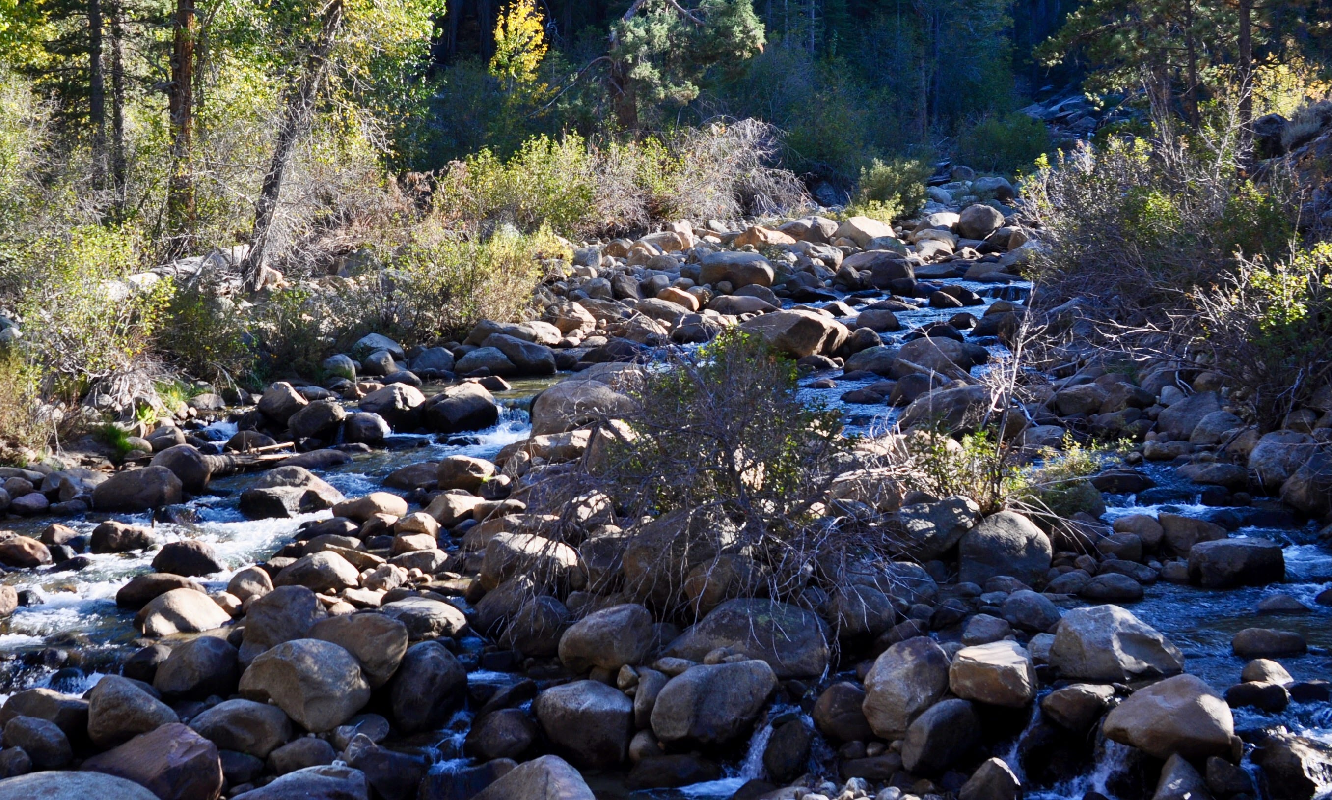 I have fallen three times. Twice on my right elbow and once on that hip. I’ve been navigating with the chest pack, worried I might face plant despite my extensive experience bouldering on dry land. I’m about to lose nervous connection to the front of my feet. I believe I am sending commands to my toes, but I cannot be sure if they are responsive. My ears tell my I’m falling, my elbows and wrists confirm the failure. But now it’s my turn. I am on the right, JD gestures me towards him in the middle. I’m ready, suffering and all. I see the pool, he points out the parade of slow bubbles. I get right on it. I’m squatting low as I move past a large granite boulder that dams up the river on my right so that I can get to its edge where the small waterfall exits the calmer waters. Ten feet behind me is the far edge of the boulder where the water trickles more slowly from the pool. I cast directly into the bubbles and keep the stick up. I’m mostly in shadow so I can see my white and orange fly which is no wider than my thumb. It’s eight feet in front of me and floats gently on the surface as the bubbles pop around it. It’s coming towards me and then slowly veers off to the right, behind the boulder and out of sight. But my stick is high and I can see where the leader is and thus my bait.