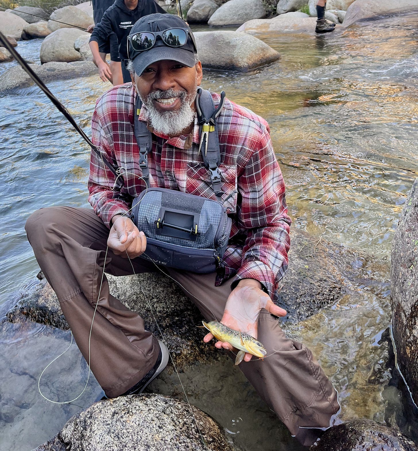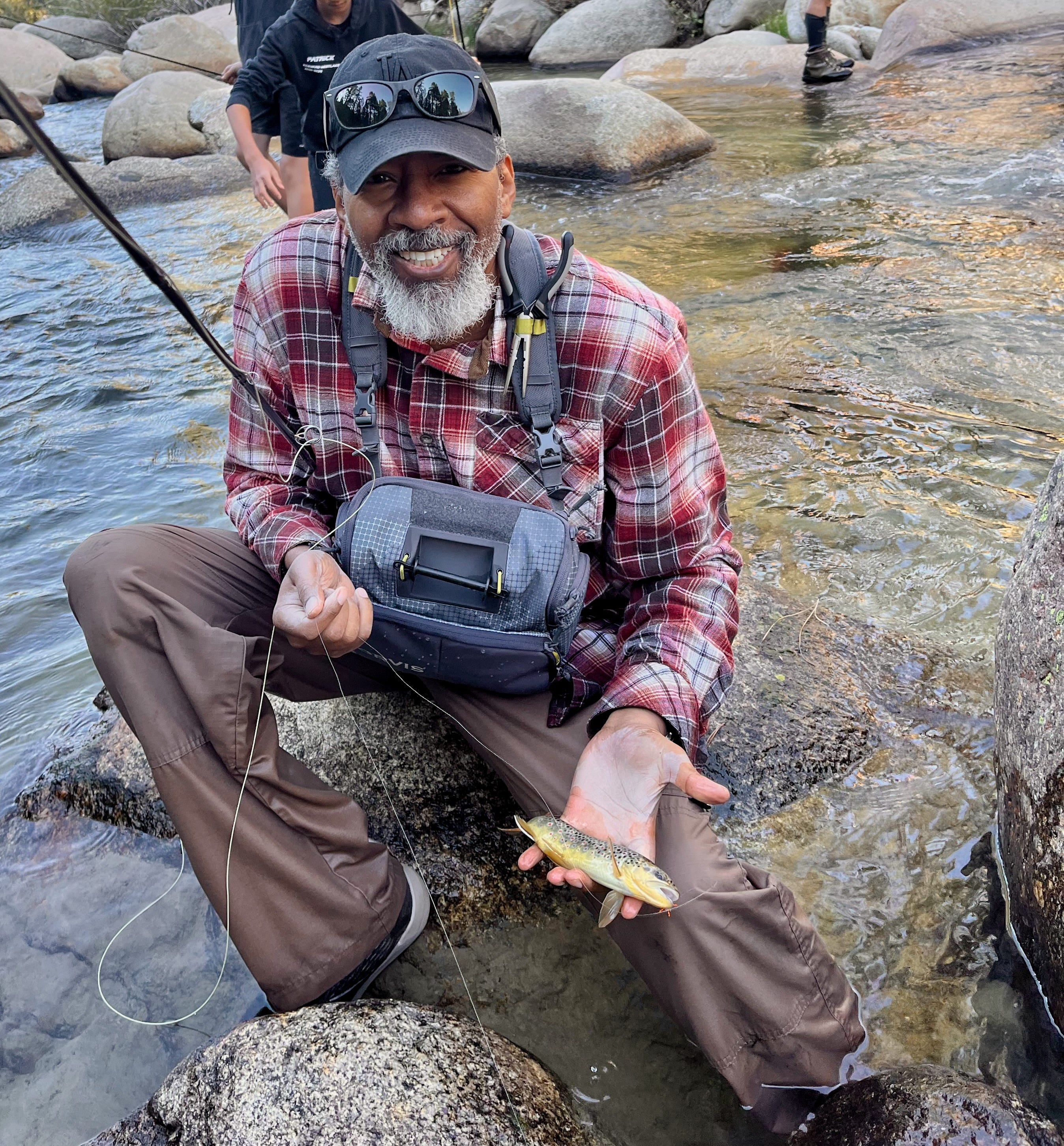 On the South Fork San Joachin River in central eastern California, the water temperature is in the mid 60s as is the air. The sky is crystal blue and the sun beats down brightly. I have special shoes and socks made out of surfer suit material. As many streams as I have walked through in my life, never had my feet been so comfortable. I’m wearing a thick flannel shirt, tac pants and my low key LA Dodgers hat, having stripped off the large backpack and long sleeve undershirt. Our guide, JD tells us that we’re going to be wet and that everyone falls. So I leave the SLR in the Toyota. I’m down to a small front pack with Slim Jims, my iPhone and a pair of needle nose pliers.