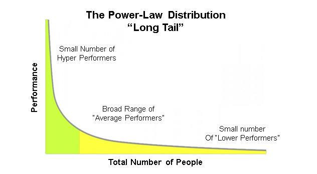 Pareto Law works like this: if you take 1000 composers over time, about 32 of those composers will get 50% of the attention. If you have 10,000 rock songs, about 100 of them will get 50% of the airplay.