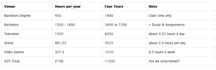 So what if you are hungry for the twittilations of social media? Nothing really wrong with that in an open society. Sam and Paul agree that Twitter can be fascinating. Paul brought up the example of the CEO of Netflix saying that the enemy of his company’s world domination is nothing more or less than sleep. All your attention all the time at any and every level of sophistication or bullshit. That’s the job of the entertainment industry of which news and political reporting are just subsidiaries. Remember, you don’t get a degree by spending time in front of the telly or your mobile. Consider the following rough estimates: