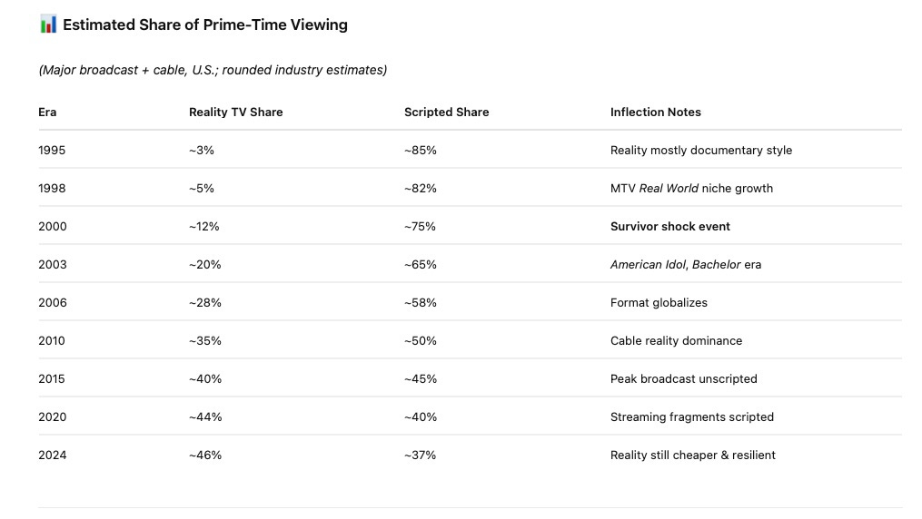 Let’s talk about reality TV shows. I don’t think one should underestimate the failing of intellectual discernment that shows up in this chart. Fewer and fewer people are watching scripted television. Is that because watching the personal dramas of ordinary peasants is more fascinating, or simply because it costs less to do and takes less intellectual work of scriptwriting, consequently quality is being starved out?