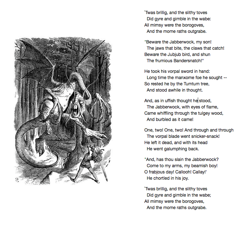 The greatest thing about the poem by Lewis Carroll is that it begins and ends on the same note. ’Twas always brillig. ’Tis brillig today. This is human experience and always has been and always will be. Carroll’s is a tale of the men who warns his son to take up his sword against this world’s dangers. Yes people need to be reminded, but maybe people decide to be blind and deaf. One can pretend to be confused by the nonsense words, but they don’t obscure, they universalize. What remains is the simple human responsibility. My niece must watch her back. I must take care of my mother. My brother must arrest the bad guy, as it was in the beginning, is now and ever shall be.