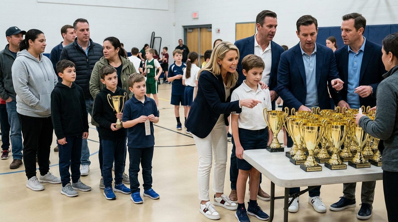 Bowen explores the social consequences of elite complacency and populist politics:Participation trophies and helicopter parenting symbolize how elites create inside games and protected environments that limit genuine merit-based advancement for the middle class.